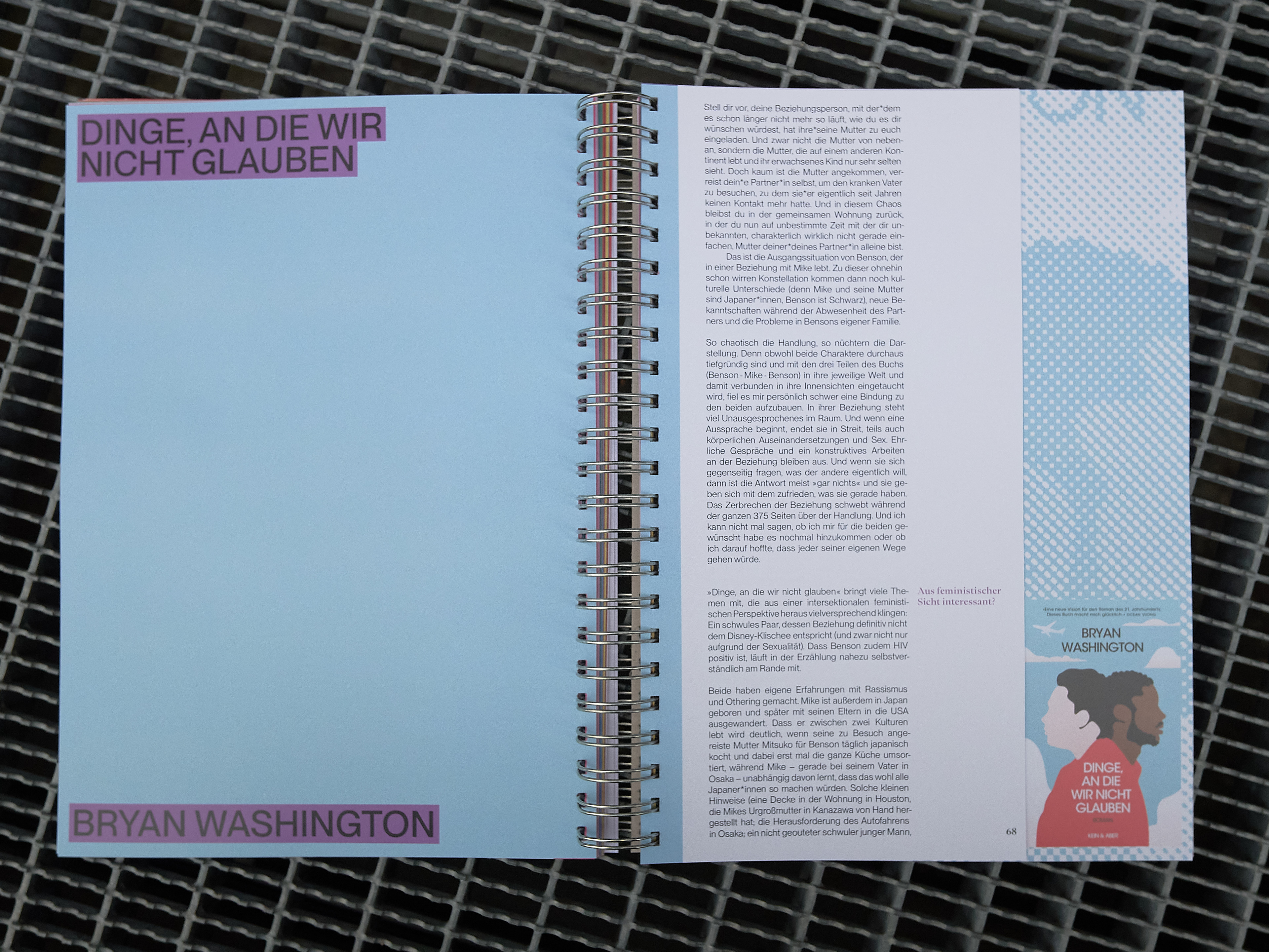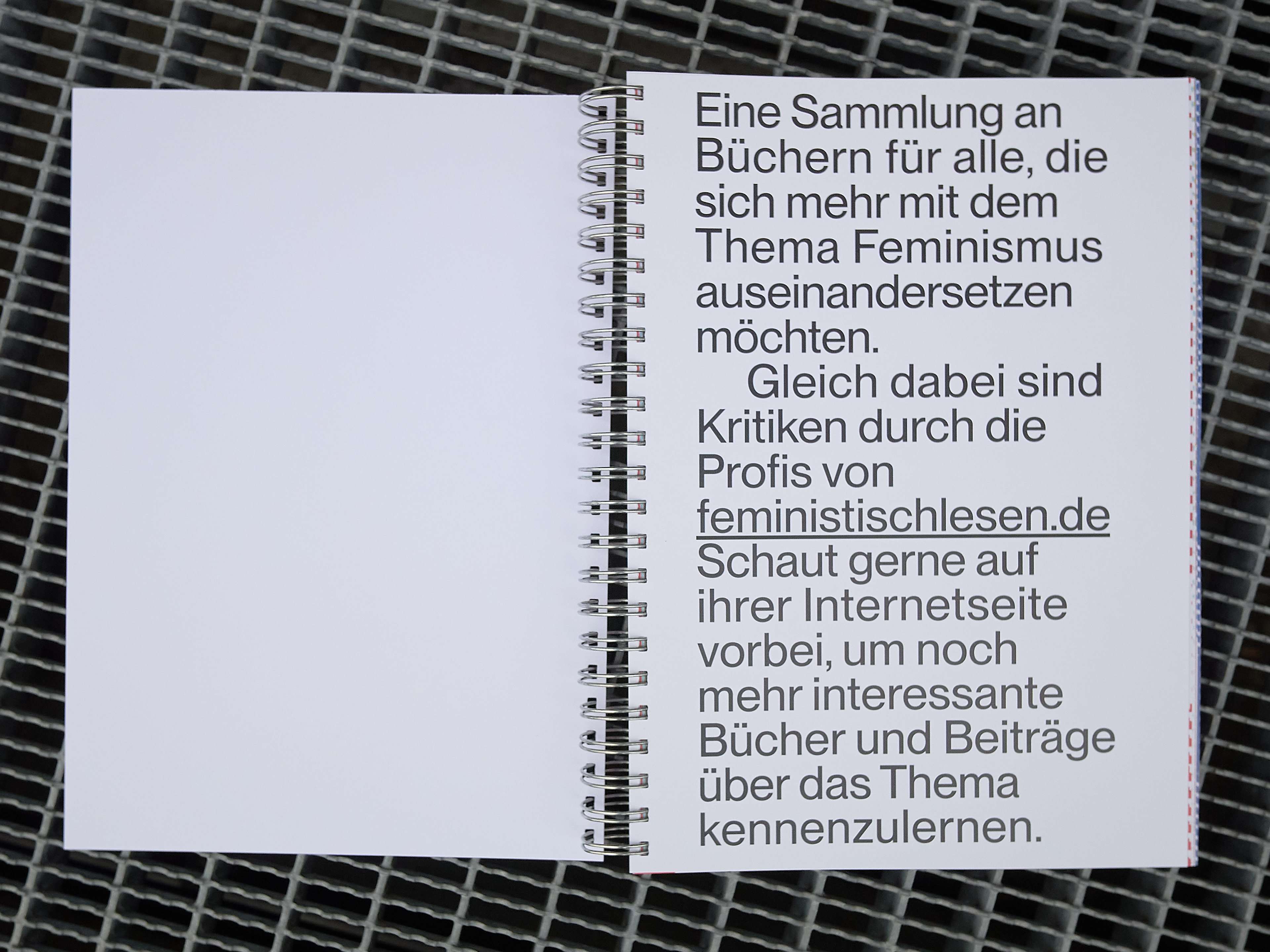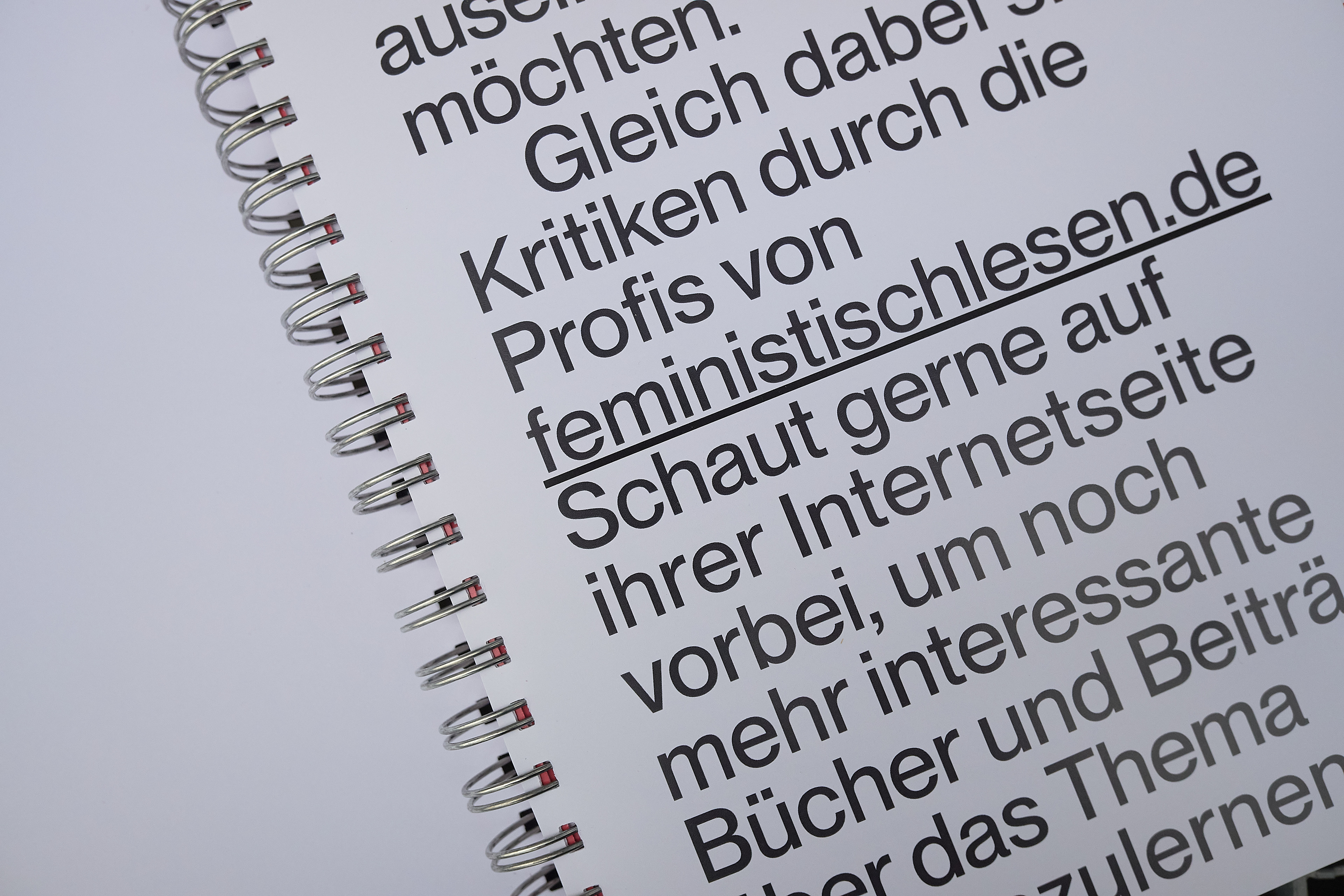 As part of my typography class, I designed a book about feminism. The requirement was to use a ring binding in A4 format. I decided to put together a collection of feminist books and include reviews from feministischlesen.de.