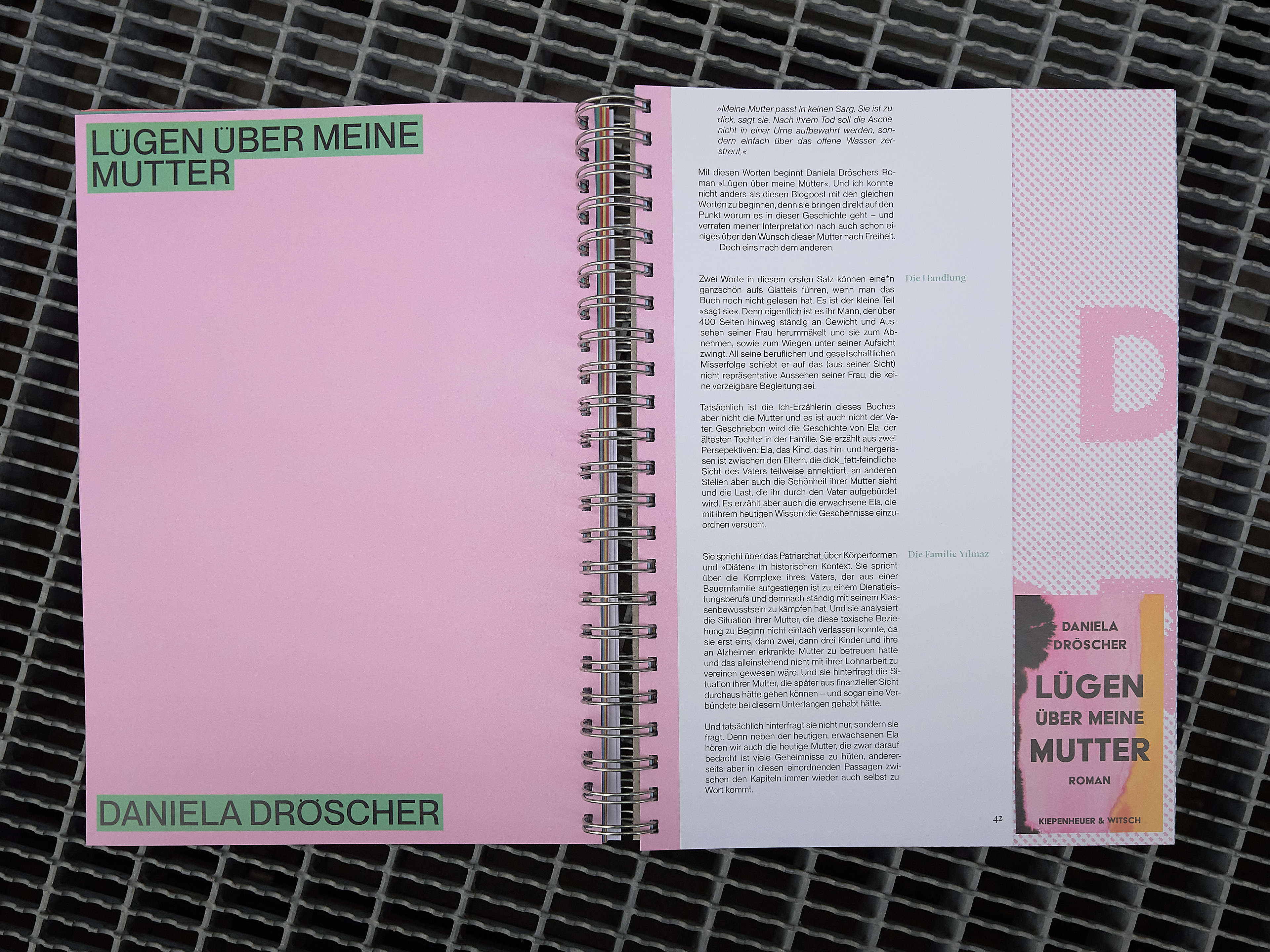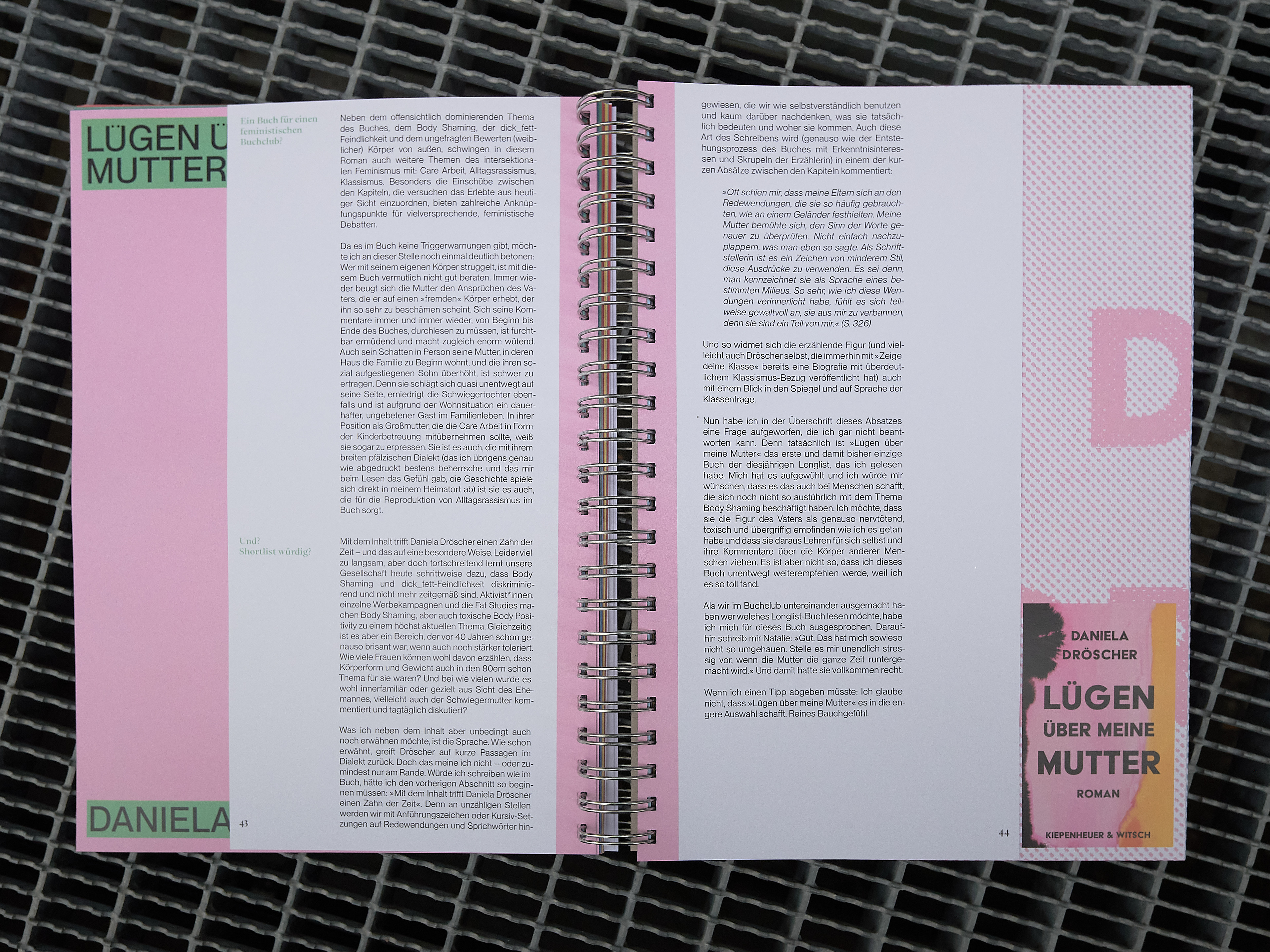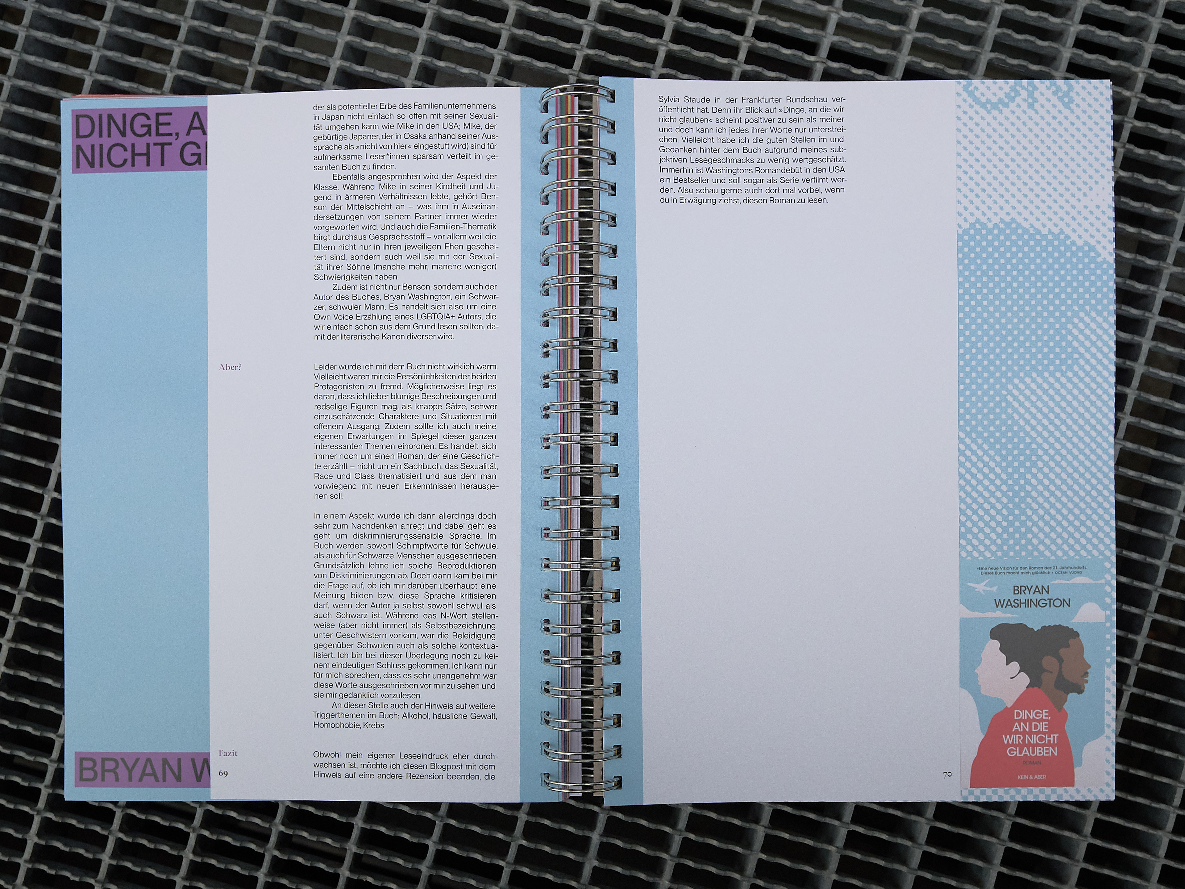 As part of my typography class, I designed a book about feminism. The requirement was to use a ring binding in A4 format. I decided to put together a collection of feminist books and include reviews from feministischlesen.de.